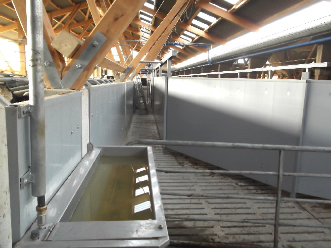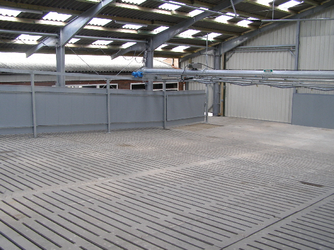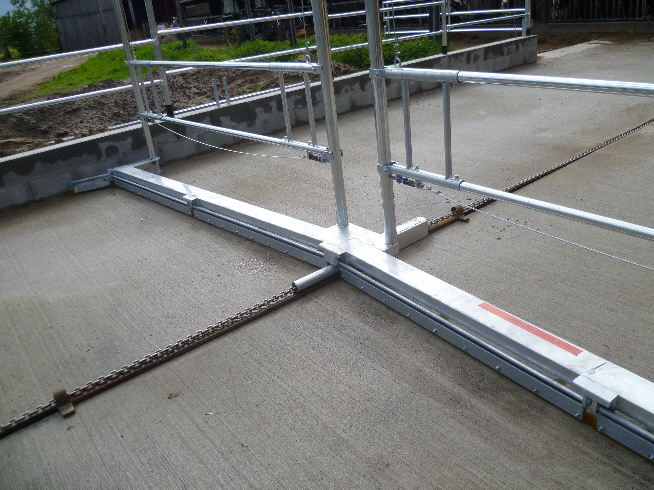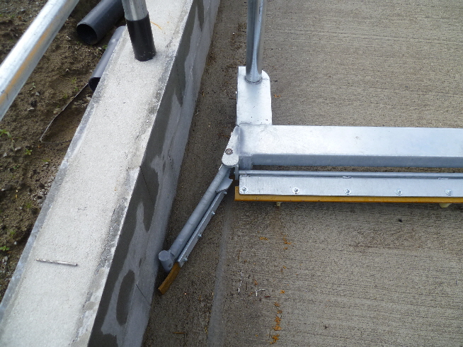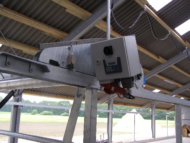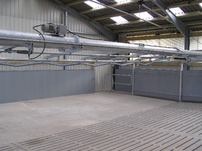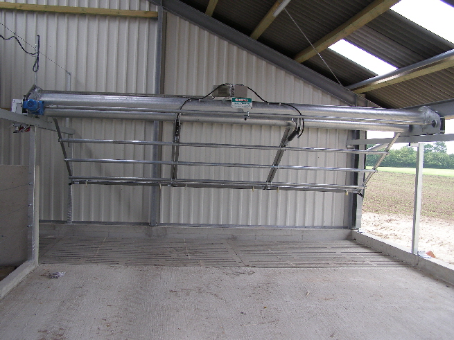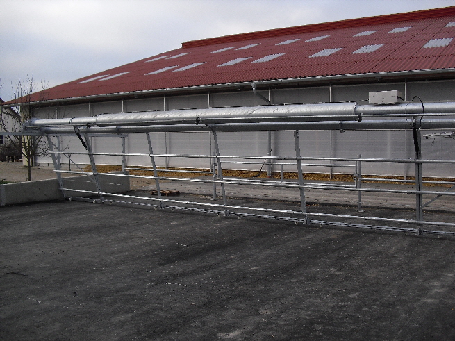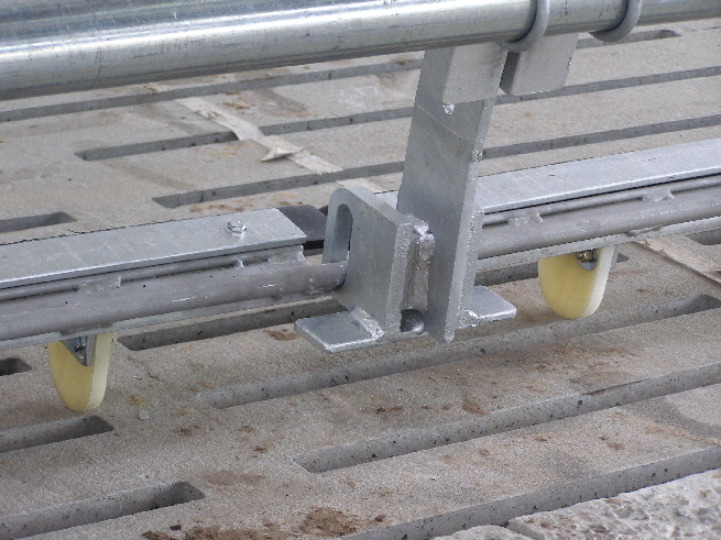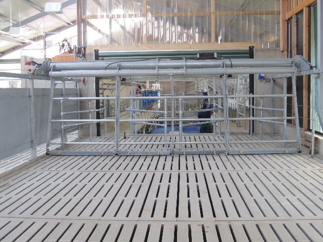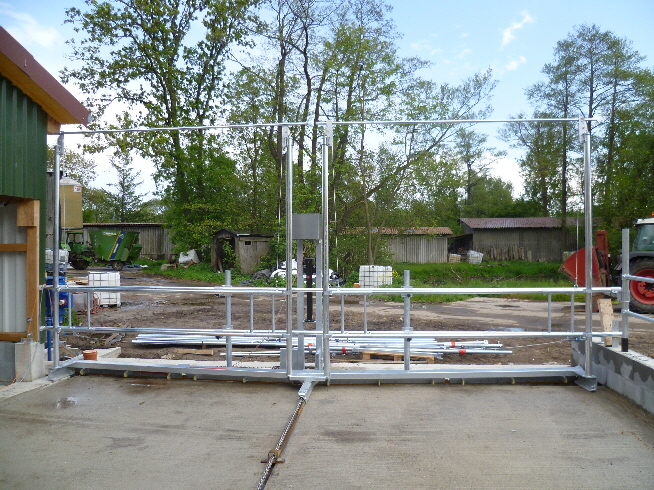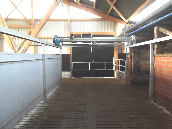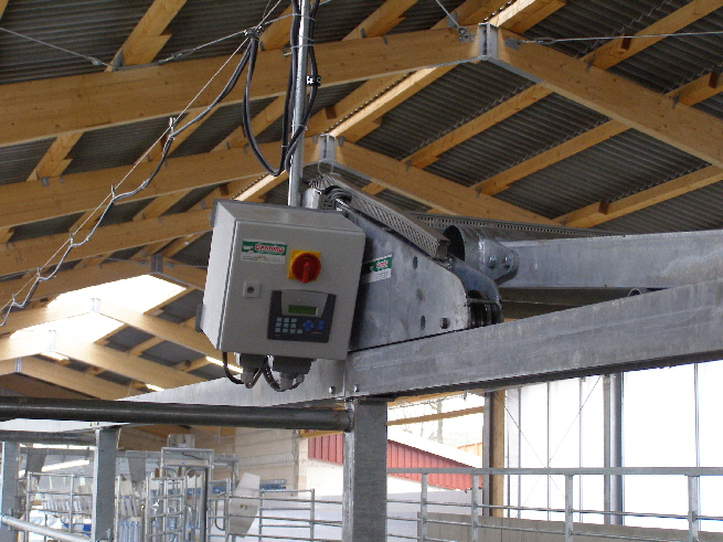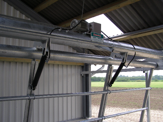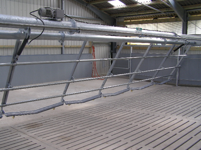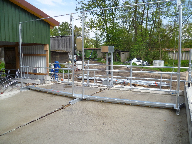 Der Kuhtreiber dient zum Vortreiben der Kühe im Vorwartehof. Er wird elektrisch angetrieben. Das Absperrgitter läßt sich hydraulisch hochschwenken.
